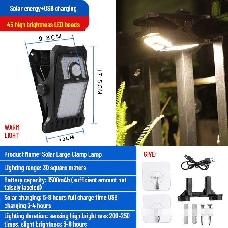 Solar Clamp Lamp LED Solar Garden Light Outdoor Clip-on Motion Sensing Light Induction Camping Light for Outdoor Courtyard Fence Wall.